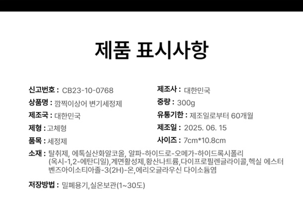| 1. 화학제품안전법 및 「안전확인대상생활화학제품 지정 및 안전ㆍ표시기준」에 따른 표시사항 | 상품 상세정보 참조 |